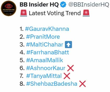 According to BBInsiders, the contestants who are leading the voting charts are Gaurav Khanna, Amaal Mallik, Pranit More, Malti Chahar and Farrhana Bhatt. The bottom three contestants are Tanya Mittal, Ashnoor Kaur and Shehbaz Badesha.